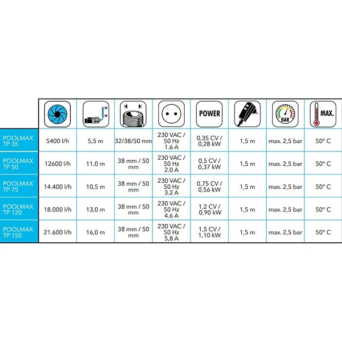 Solide et délivrant un débit max d’eau traitée de 5,4m3/heure, la pompe Poolmax pourra être utilisée en combinaison avec votre filtre à sable et permettra une bonne circulation de l’eau dans votre bassin.